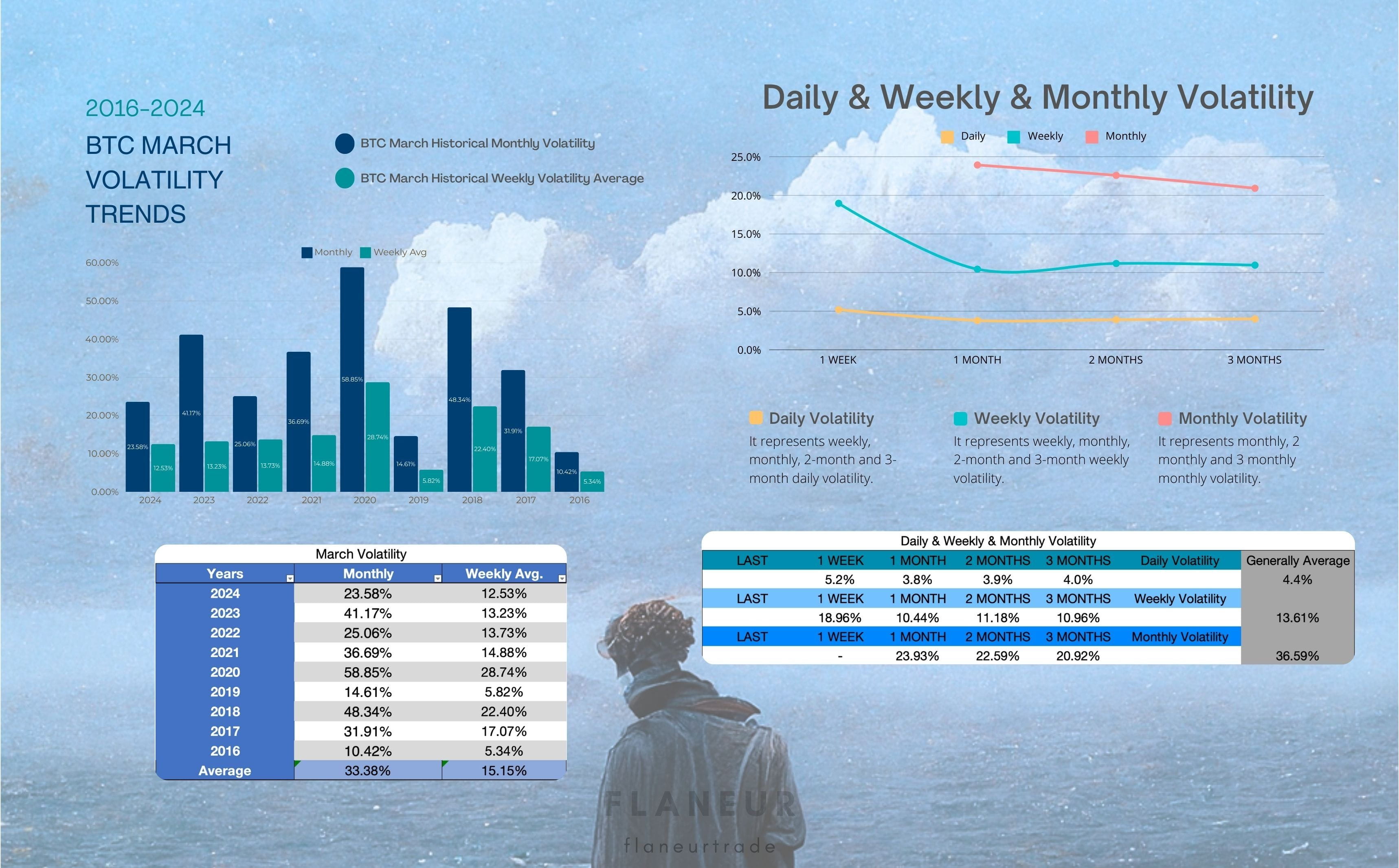 Marzo presenta un handicap. A marzo 2017, la sua ascesa da $15 a $55 ha creato una volatilità del 250%. Questo è abbastanza significativo da fuorviare i nostri dati. Pertanto, condividerò e rappresenterò i rapporti escludendo i dati del 2017. Dopo questo aggiustamento, la volatilità media mensile è del 66%, settimanale circa del 22%. Escludendo il 2017, la media mensile diventa del 40%, settimanale del 17,5. L'intervallo di volatilità implicita del 66% mostra $750-3700, il 40% mostra $1340-3140, e settimanale mostra 1965-3160. La regione 2550 può essere monitorata come pivot.