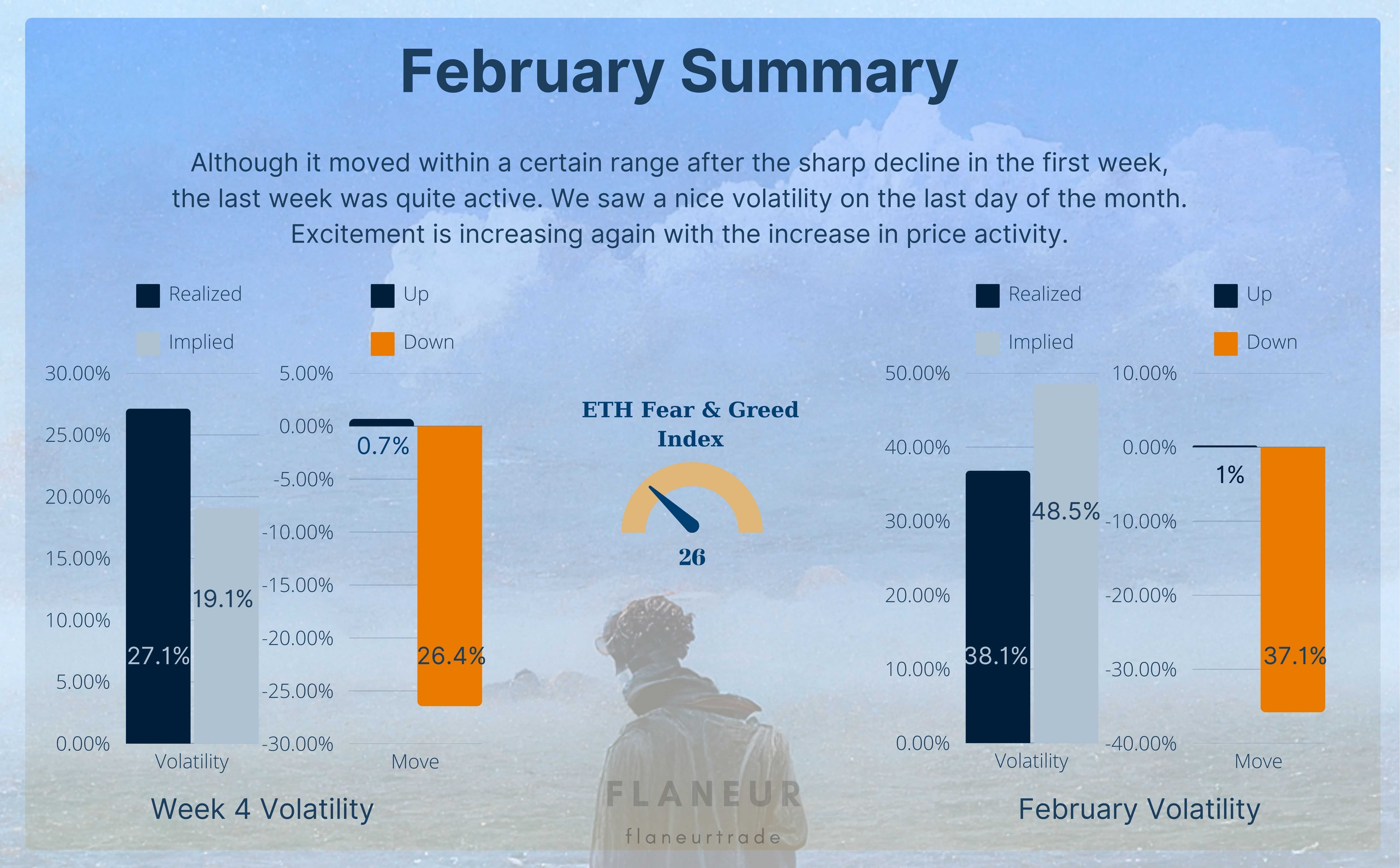 L'ETH ha subito un calo del 36% dopo l'apertura mensile, seguito da un movimento di range tra 2500-2850. Con il calo della scorsa settimana, la regione 2075 ha nuovamente fungito da supporto. Si è avvicinato alla volatilità implicita con una volatilità mensile del 38%.