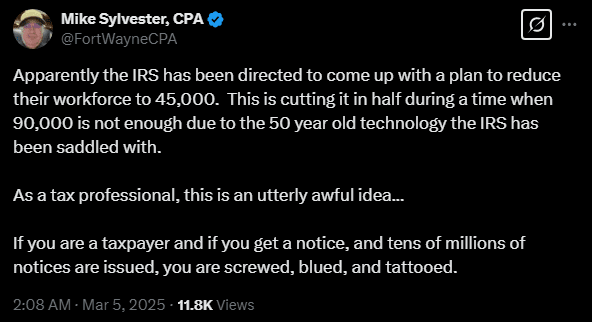 L'esperto fiscale Mike Sylvester ha avvertito che ridurre la forza lavoro della metà potrebbe interrompere gravemente le operazioni dell'agenzia, causando ritardi nell'elaborazione delle tasse e nei rimborsi. “Gli Americani potrebbero dover aspettare molto più a lungo per le dichiarazioni fiscali, e i servizi fiscali complessivi potrebbero deteriorarsi,” ha notato Sylvester.