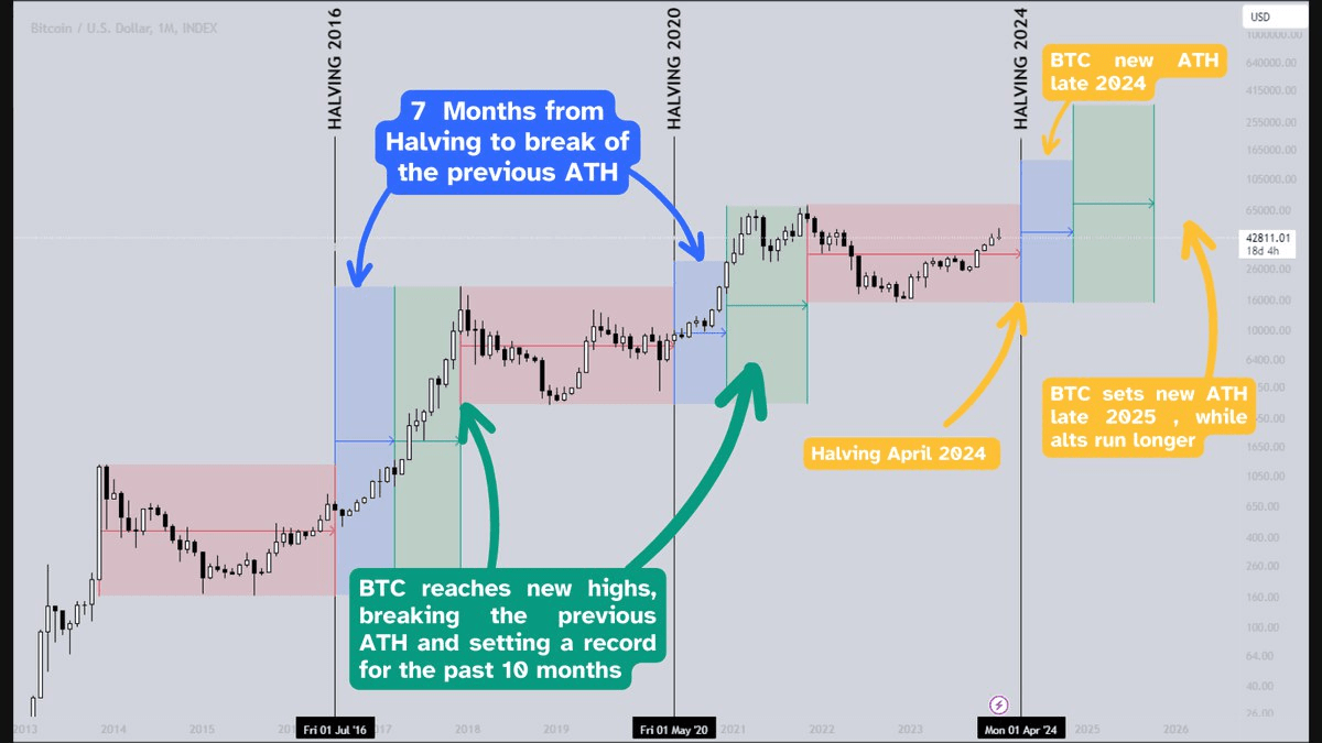 Storicamente, questo periodo è molto importante. Spesso si verifica un crollo lampo pochi mesi prima del dimezzamento, BTC scende del 50-60%, offrendo un'opportunità di acquisto. Poi (circa 7 mesi dopo il dimezzamento) BTC raggiunge il precedente ATH, e 10 mesi dopo vive un aumento parabolico. Almeno è stato così nel 2016 e nel 2020.