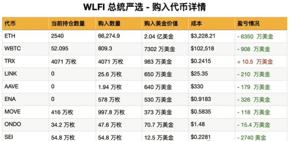 A questo punto, WLFI ha speso complessivamente 309 milioni di dollari per acquistare attivamente 9 token; a causa dell'aumento di AAVE/ONDO e altri token ieri, le perdite accumulate dopo questo aumento si sono ridotte a 80,96 milioni di dollari, di cui $TRX è l'unico asset che è passato da perdita a guadagno.