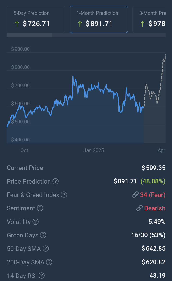 Secondo la nostra attuale previsione del prezzo di Binance Coin, si prevede che il prezzo di Binance Coin aumenti del 48,08% e raggiunga $ 891,71 entro il 6 aprile 2025. Secondo i nostri indicatori tecnici, il sentiment attuale è ribassista mentre l'Indice di Paura e Avidità mostra 34 (Paura). Binance Coin ha registrato 16/30 (53%) giorni verdi con una volatilità dei prezzi del 5,49% negli ultimi 30 giorni. Basandosi sulla previsione di Binance Coin, ora non è un buon momento per acquistare Binance Coin..
