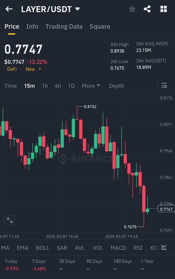 Attualmente, il prezzo di LAYER/USDT è attorno a 0.7747, indicando un potenziale trend ribassista a breve termine. In futuro, se il prezzo rompe al di sotto del livello di supporto di 0.7600, potrebbe portare a un ulteriore slancio ribassista, mentre una rottura sopra 0.7800 potrebbe segnalare un'inversione. segnale di trading con obiettivi di take-profit più stretti basati sul prezzo attuale di LAYER/USDT.
