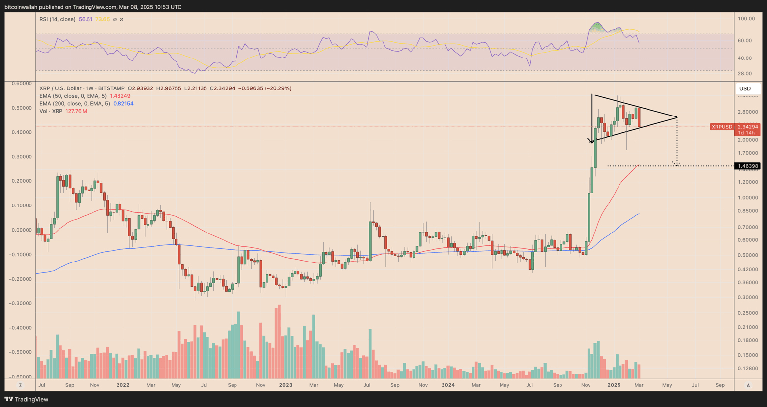 • Applicando lo stesso schema a XRP, il prezzo obiettivo potrebbe scendere a $1.46, in linea con l'EMA a 50 settimane.