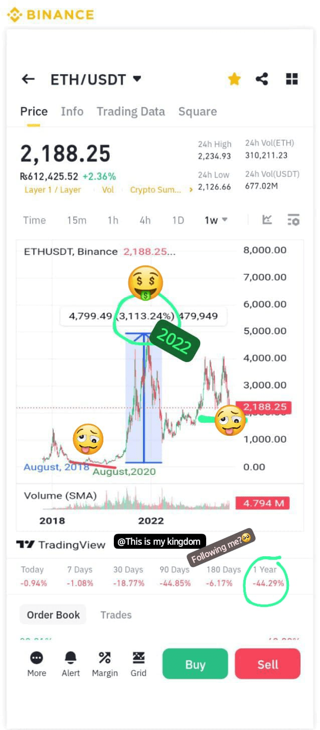 🔹 2020-2022 Bull Run: L'ascesa di DeFi, NFT e l'interesse istituzionale ha portato Ethereum a nuove vette. Dai minimi del 2020, ETH è aumentato di quasi il 3.800%, raggiungendo un picco di circa $4,800 alla fine del 2021 prima delle correzioni nel 2022.