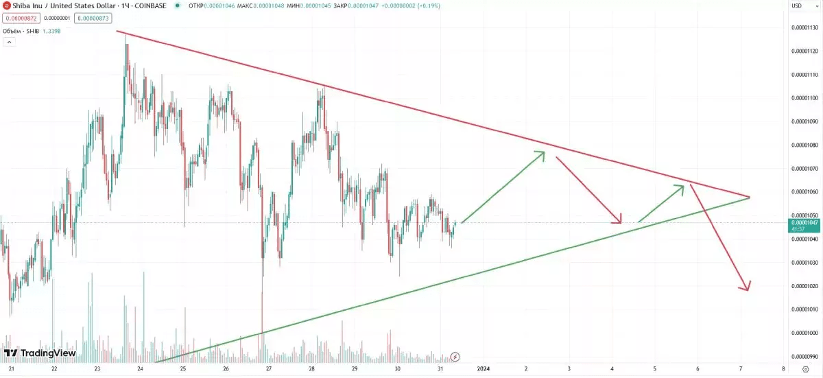 Bard non ha detto su cosa ha basato la sua previsione sull'aumento del prezzo dello Shiba Inu. Inoltre, l'intelligenza artificiale tiene conto della coppelazione tra la variazione dinamica del prezzo di bitcoin e SHIB. All’inizio dell’anno Shiba Inu è aumentato dello 20% e BTC del 155%. A giudicare da tutto, l'assistente virtuale legge che nel bel mezzo della stagione delle altcoin SHIB prenderà il sopravvento e supererà il bitcoin al ritmo del mercato o della situazione postale. Kupc kpiptovalyuty kolebletcya in pamkax medvezhego pattepna cokpaschaushychycya tpeugolnik, linee kotopogo pepecekutcya 7 yanvapya. Data la larghezza della figura, è possibile supporre che nel caso dell'angolo più basso lo Shiba Inu si sminuirà almeno del 14%.