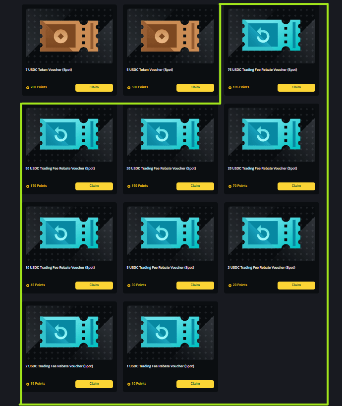 Per 500 punti puoi ottenere (5 - $USDC ) su SPOT. Per 700 punti puoi ottenere (7 - $USDC ) e per coloro a cui non interessa, questi punti possono essere scambiati per "Voucher" - Fee su Binance — offrono uno sconto sulle commissioni per le operazioni di trading o altre transazioni sulla piattaforma. Questo consente di ridurre le commissioni di trading di una certa percentuale o addirittura di coprirle completamente entro un limite definito.