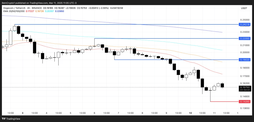 Se la tendenza attuale al ribasso continua, DOGE potrebbe testare il livello di supporto chiave di 0,142 dollari. Se questo livello di supporto viene violato, DOGE potrebbe scendere sotto i 0,14 dollari per la prima volta dal ottobre 2024, esplorando ulteriori livelli inferiori.