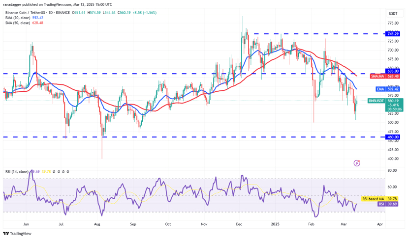 Il rally di sollievo è previsto affrontare vendite alla EMA a 20 giorni ($592). Se il prezzo scende bruscamente dalla EMA a 20 giorni, gli orsi cercheranno di far affondare la coppia BNB/USDT sotto $500. La coppia potrebbe scendere a $460 se ci riusciranno.