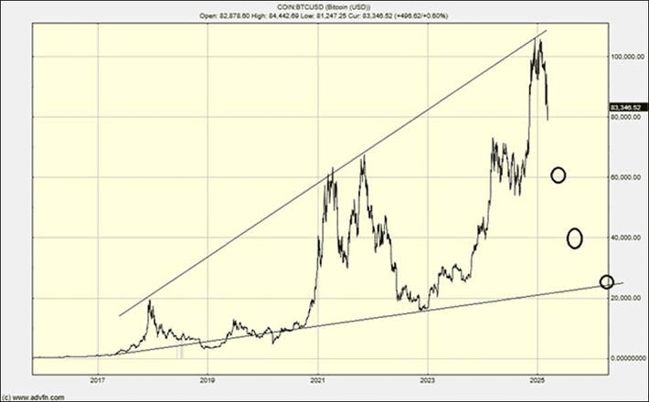 In questo grafico, puoi vedere chiaramente i cicli e la loro progressione. Le aree cerchiate rappresentano i livelli di prezzo a cui prevedo che il bitcoin possa scendere; i valori più alti rappresentano quelli che credo siano obiettivi più probabili. Una caduta al di sotto dei $30.000 sembra improbabile, anche se è difficile giudicare in questi tempi iper-volatile.