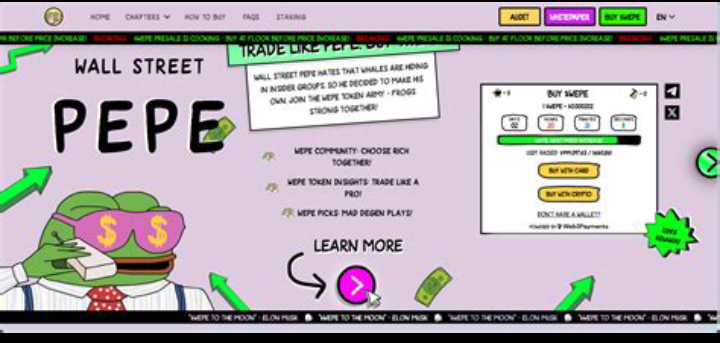 La criptovaluta Wall Street Pepe (simbolo: WEPE) è una moneta meme digitale ispirata al famoso personaggio del ranocchio Pepe, e mira a consentire ai piccoli investitori di ottenere un impatto simile a quello dei grandi investitori (whales) nel mercato delle criptovalute.