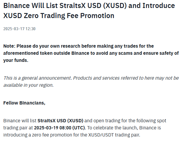 Ciao a tutti, fam di crypto! 👋 Se hai tenuto d'occhio i mercati, probabilmente hai sentito l'ultimo gossip—Binance sta quotando StraitsX USD (XUSD) il 19 marzo 2025! 🎉 Come qualcuno che è stato a fondo nelle tendenze blockchain, dovevo approfondire questo e spiegartelo.
