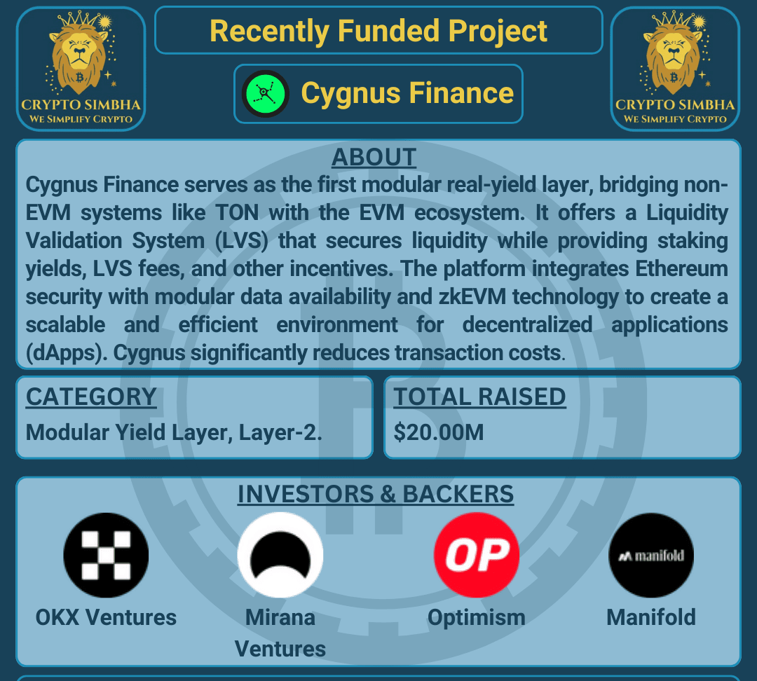 🔹 Informazioni: Cygnus Finance funge da primo layer di rendimento reale modulare, collegando sistemi non-EVM come TON con l'ecosistema EVM. Offre un Sistema di Validazione della Liquidità (LVS) che garantisce liquidità fornendo rendimenti da staking, commissioni LVS e altri incentivi. La piattaforma integra la sicurezza di Ethereum con la disponibilità di dati modulari e la tecnologia zkEVM per creare un ambiente scalabile ed efficiente per applicazioni decentralizzate (dApps). Sfruttando la disponibilità di dati modulari, Cygnus riduce significativamente i costi di transazione e migliora la scalabilità. Supporta anche il prestito di stablecoin e il trading con leva, supportato da beni del mondo reale come i Treasury Bills statunitensi. Gli sviluppatori beneficiano dei suoi Circuiti Universali 2.0, che semplificano il deployment di applicazioni a conoscenza zero (ZK). Cygnus utilizza gli Oracoli RedStone per una corretta valutazione degli asset crypto, garantendo affidabilità nel suo ecosistema. L'architettura modulare della piattaforma è progettata per supportare casi d'uso innovativi in ambito DeFi, gaming e applicazioni guidate dall'IA.🚀🌐