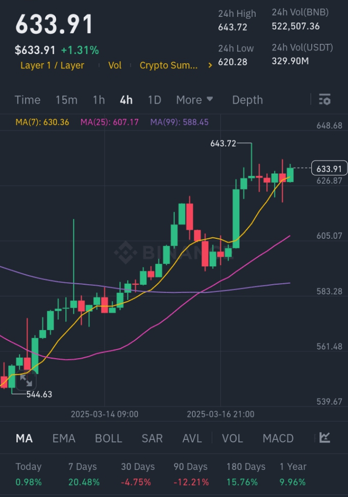 Azione del Prezzo: BNB ha recentemente toccato i $643.72, dimostrando la sua forza nel mercato. Nonostante lievi ritratti, sta mostrando resilienza, il che è un segnale rialzista.