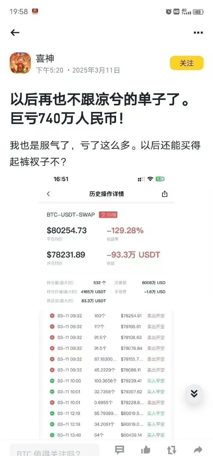 L'11 marzo 2025, un grande piccolettino con il nome utente Xishen ha utilizzato la funzione di copia trading della piattaforma per seguire Liangxi in un contratto, e in una sola notte ha perso quasi 933.000 unità, equivalenti a circa 7,4 milioni di RMB.