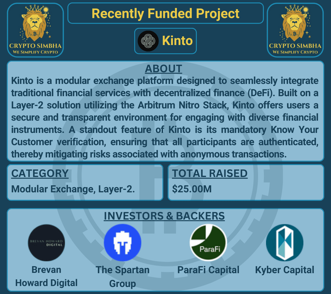 🔹Informazioni: Kinto è una piattaforma di scambio modulare progettata per integrare senza soluzione di continuità i servizi finanziari tradizionali con la finanza decentralizzata (DeFi). Costruita su una soluzione Layer-2 che utilizza l'Arbitrum Nitro Stack, Kinto offre agli utenti un ambiente sicuro e trasparente per interagire con diversi strumenti finanziari. Una caratteristica distintiva di Kinto è la sua verifica obbligatoria del Know Your Customer (KYC), che assicura che tutti i partecipanti siano autenticati, riducendo così i rischi associati alle transazioni anonime. Questo approccio KYC di proprietà degli utenti consente agli individui di mantenere il controllo sulle proprie informazioni personali, rivelando solo i dati minimi necessari per accedere a servizi specifici.