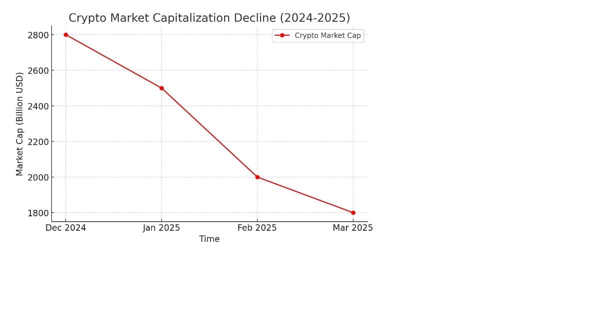 Dal dicembre 2024, il mercato globale delle criptovalute ha perso oltre $1 trilione di valore dopo gli annunci dei dazi statunitensi. Il grafico qui sotto illustra questo declino: