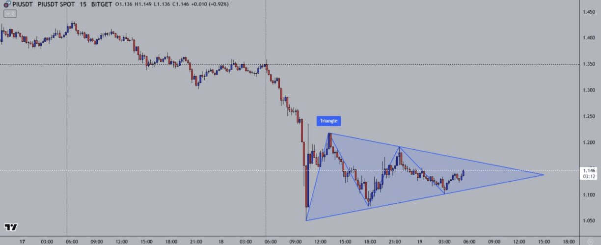 Nella scorsa settimana, il prezzo di Pi Coin ha subito una forte pressione di vendita, scendendo del 23% nel grafico settimanale. Con una capitalizzazione di mercato scesa sotto gli 8 miliardi di dollari, questa altcoin è passata dalla 11ª posizione alla 16ª. Inoltre, il volume di scambi giornaliero di Pi Coin è aumentato del 15,87%, raggiungendo i 600 milioni di dollari. Nonostante tali sviluppi, gli analisti di mercato rimangono ottimisti su questa altcoin. Il grafico dei prezzi di Pi Coin a 15 minuti mostra un modello di triangolo simmetrico, suggerendo una rottura imminente.