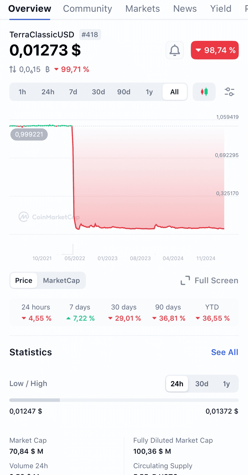 Il crollo del 2022 di LUNA e UST rimane uno dei più grandi disastri nella storia delle criptovalute, spazzando via miliardi di dollari in fondi degli investitori. Molti trader, me compreso, hanno visto i loro soldi guadagnati con fatica scomparire da un giorno all'altro mentre LUNA crollava da 116 a quasi zero—un evento catastrofico che ha scosso l'intero mercato.