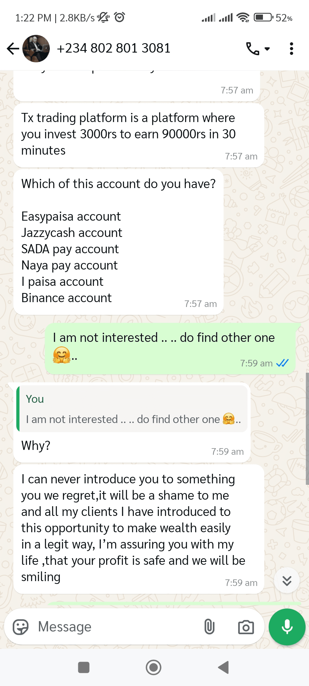Alla fine, l'intera piattaforma scompare e il truffatore blocca la vittima.