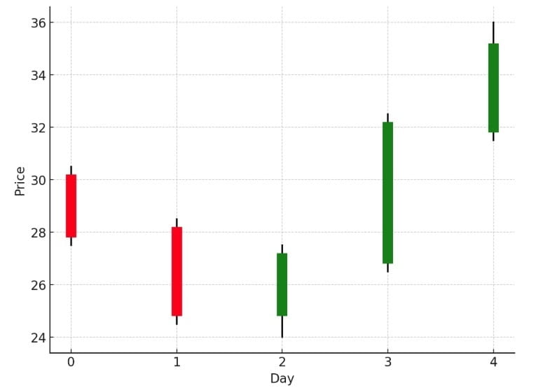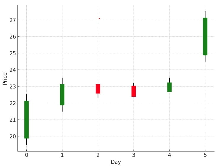 La terza candela è fortemente rialzista, indicando un cambiamento nella tendenza verso l'alto.
