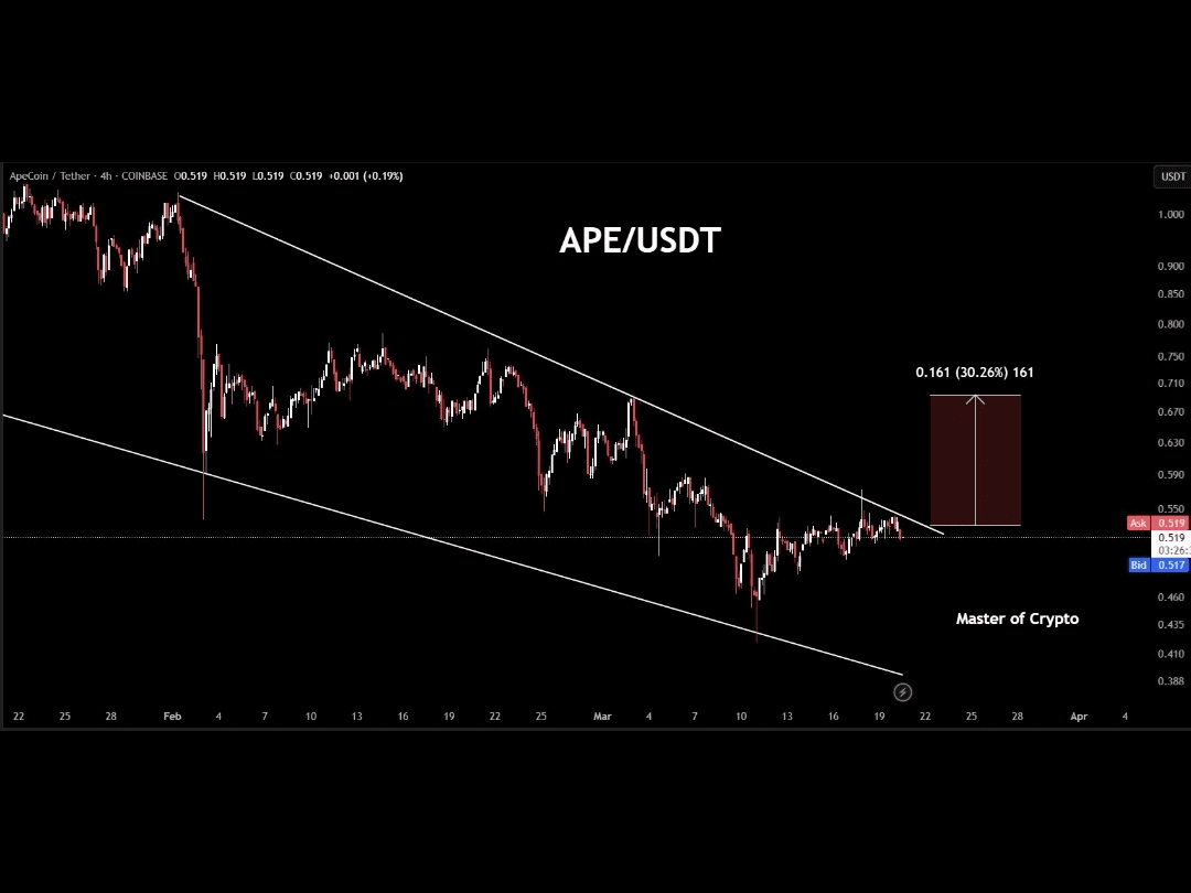 - APE sta mostrando un pattern a cuneo discendente nel timeframe di 4 ore.