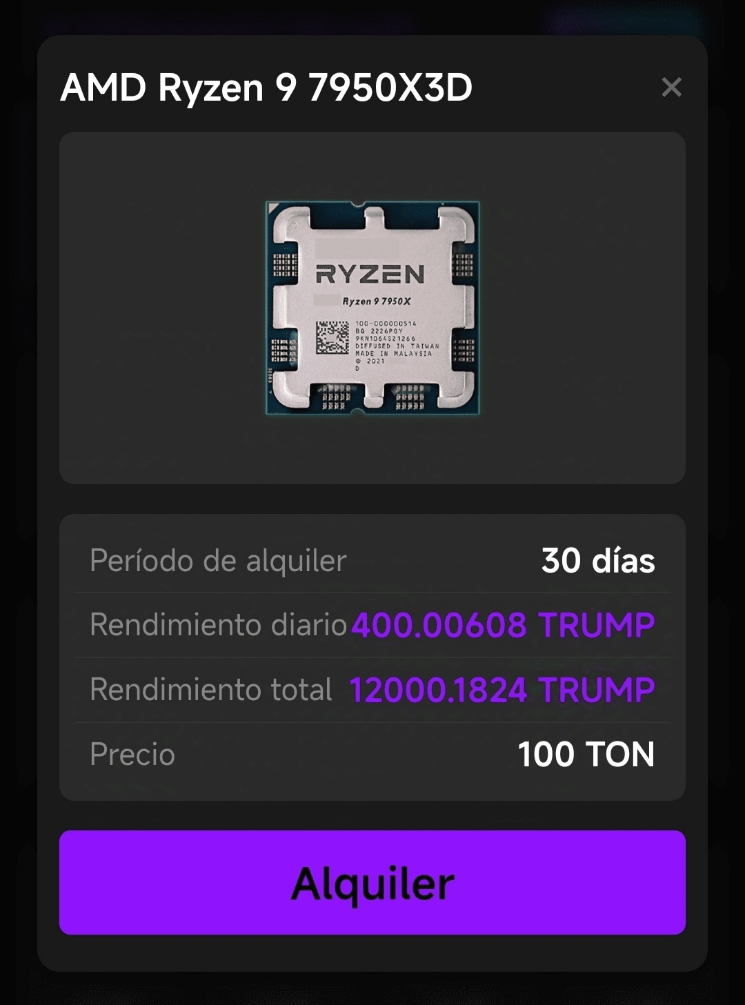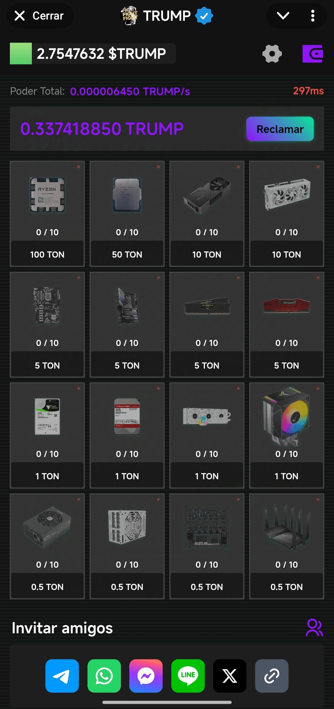 1. L'app consente agli utenti di minare la criptovaluta Trump in modo passivo. Tuttavia, i fondi possono essere prelevati solo una volta raggiunti i 100 Trump, il che può essere un processo lento senza l'acquisto di "abbonamenti" aggiuntivi, che consistono nell'acquisto simbolico di componenti del computer (processore, router, tra gli altri), i quali ti danno un impulso giornaliero per un mese, a seconda del prezzo. Immagine di esempio: