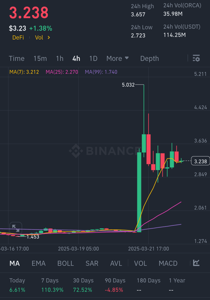 Proprio ora, ORCA si sta stabilizzando attorno a $3.23, dopo aver toccato un massimo di $5.03. Questa è la zona d'ingresso ideale prima del prossimo rialzo. Una volta che il prezzo supera di nuovo $3.65, potrebbe facilmente schizzare a $7+ nel breve termine.