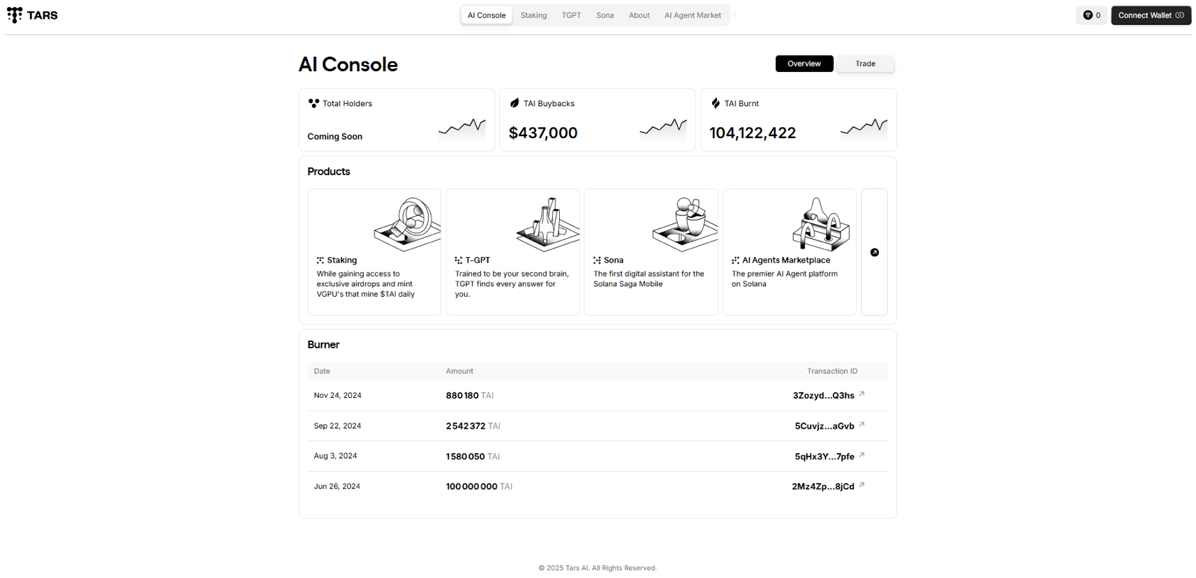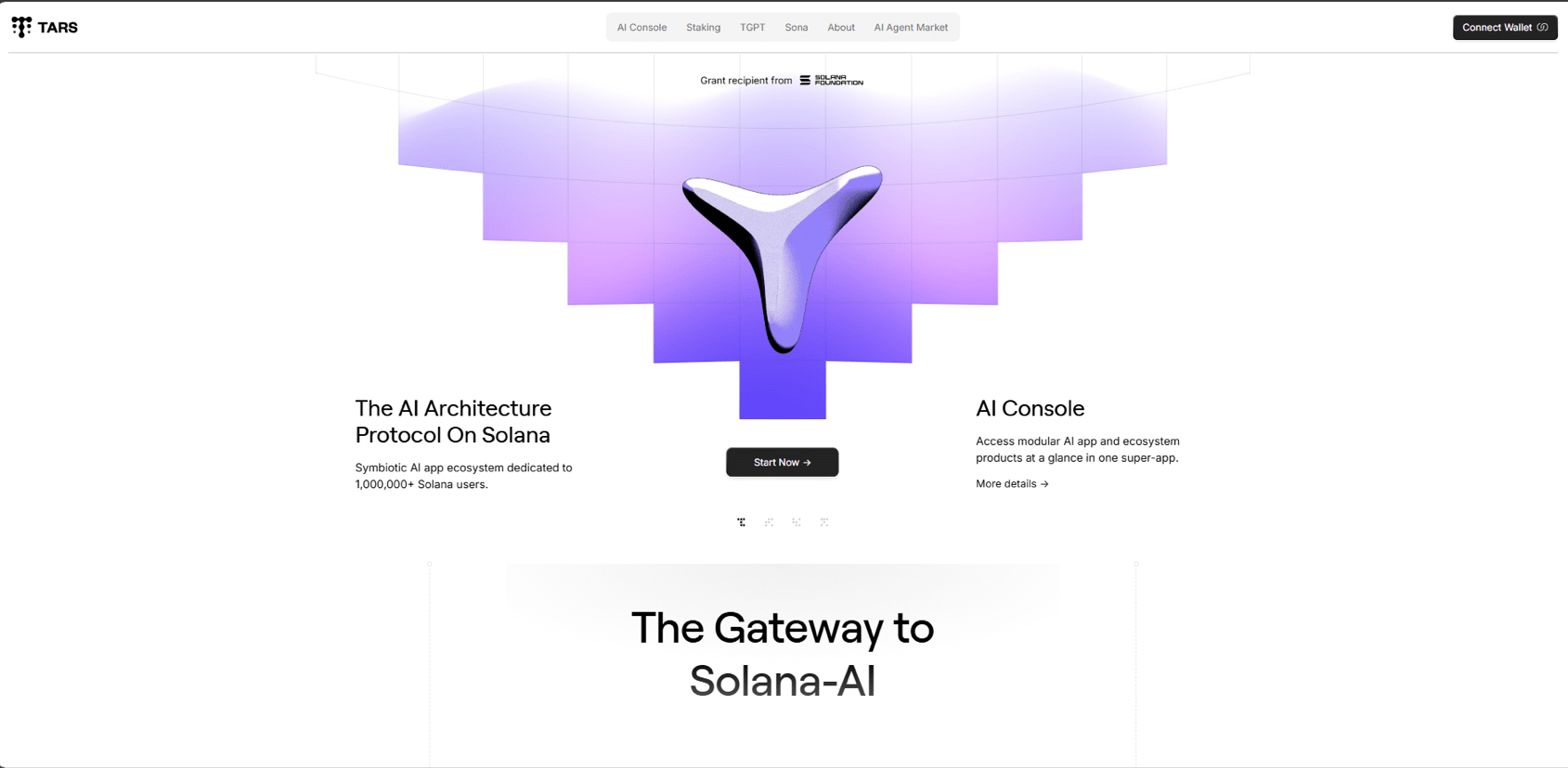 Tars AI (TAI) è uno dei primi ecosistemi focalizzati sull'AI sulla blockchain di Solana, sostenuto da un finanziamento della Solana Foundation. Questo progetto mira a migliorare l'integrazione delle tecnologie AI e Web3 attraverso una suite di strumenti e servizi innovativi, rendendolo un progetto reale e utilizzabile, a differenza di molti altri che mancano di applicazioni pratiche.