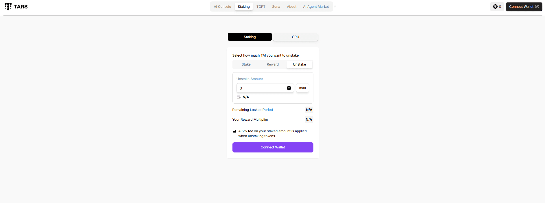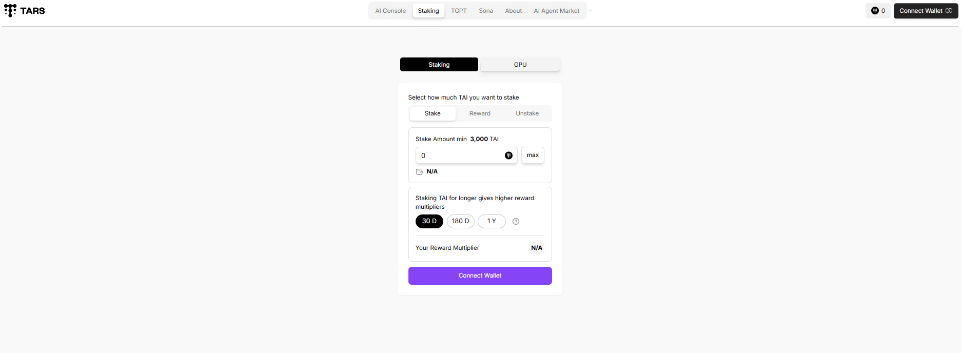 Il Tars AI Staking fornisce un modello unico per gli utenti che desiderano guadagnare un reddito passivo attraverso lo staking dei token TAI. Ciò che distingue questo servizio è la sua alta flessibilità e i premi crescenti in base alla durata dello staking.