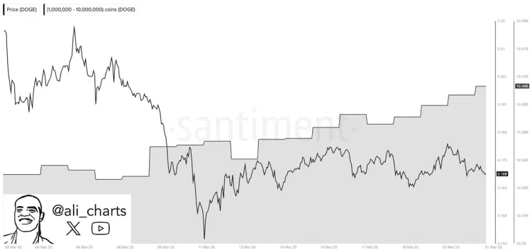 Nonostante il sentiment di mercato sia più cauto, i dati on-chain stanno rilasciando segnali positivi. Il noto analista Ali Martinez ha condiviso sulla piattaforma X che nella scorsa settimana gli indirizzi degli squali di Dogecoin hanno accumulato oltre 120 milioni di DOGE. Questo comportamento di accumulo significativo è spesso visto come un segnale rialzista, indicando che i grandi investitori potrebbero prepararsi per un potenziale rimbalzo, specialmente se Dogecoin può superare il livello chiave di resistenza di 0,18 dollari, il che potrebbe ulteriormente aumentare la fiducia del mercato.