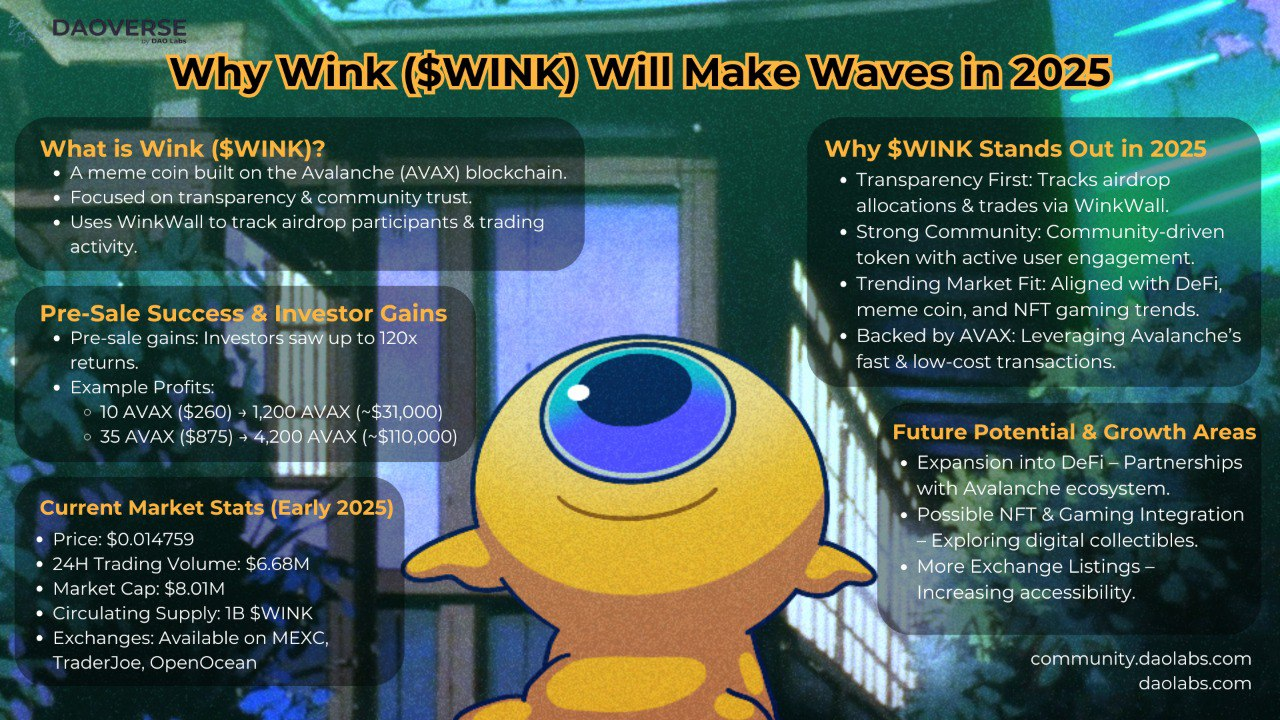 Nel dinamico mondo delle criptovalute, alcuni progetti catturano l'attenzione del mercato grazie ai loro approcci innovativi e al coinvolgimento della comunità. Uno di questi progetti pronto a fare onde significative nel 2025 è #Wink ($WINK), una meme coin che opera sulla @Avalanche_CN blockchain. Oltre al suo branding giocoso, Wink introduce caratteristiche di trasparenza e responsabilità che lo distinguono da altri beni digitali.
