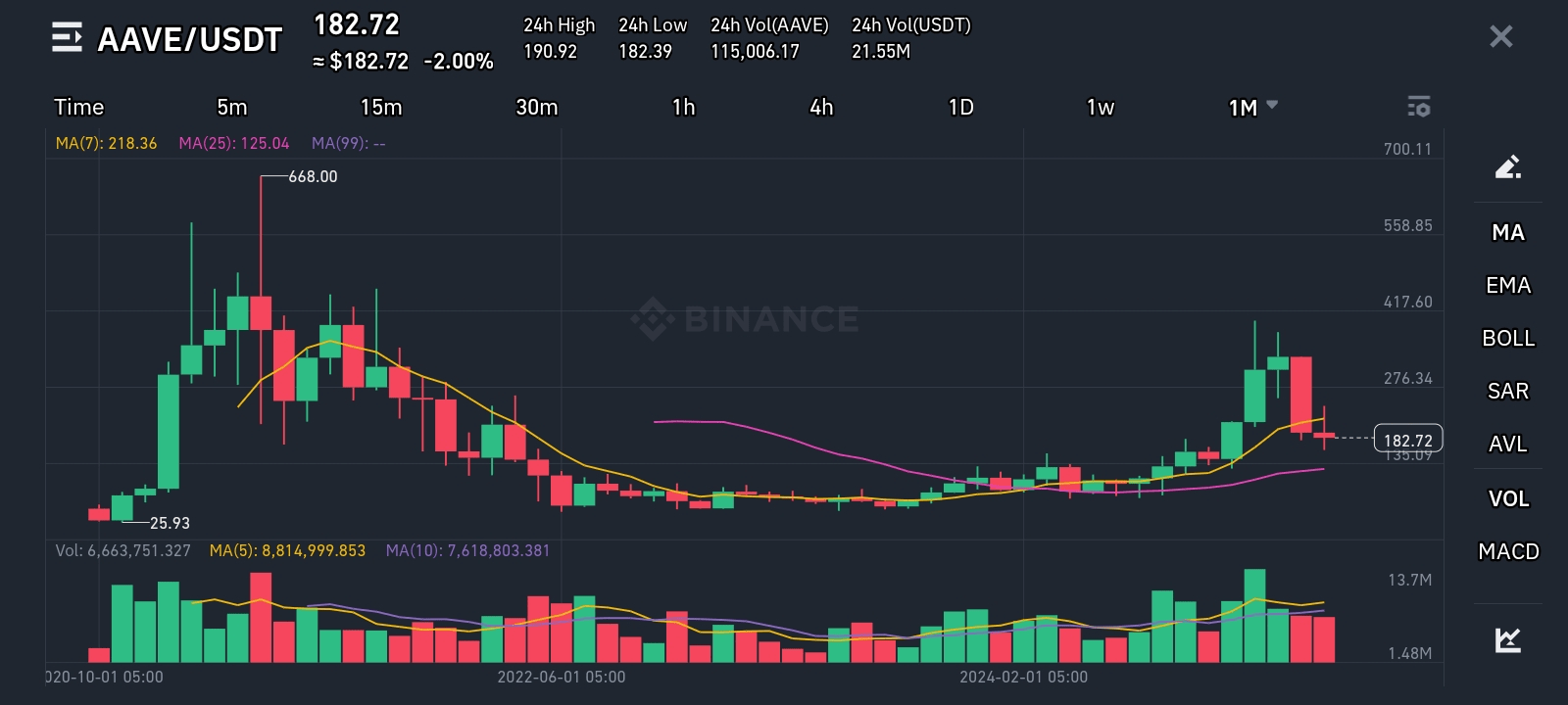 Il prezzo è attualmente vicino alla MA a 7 giorni (218.36) e alla MA a 25 giorni (125.04), mostrando che ha testato i livelli di supporto.