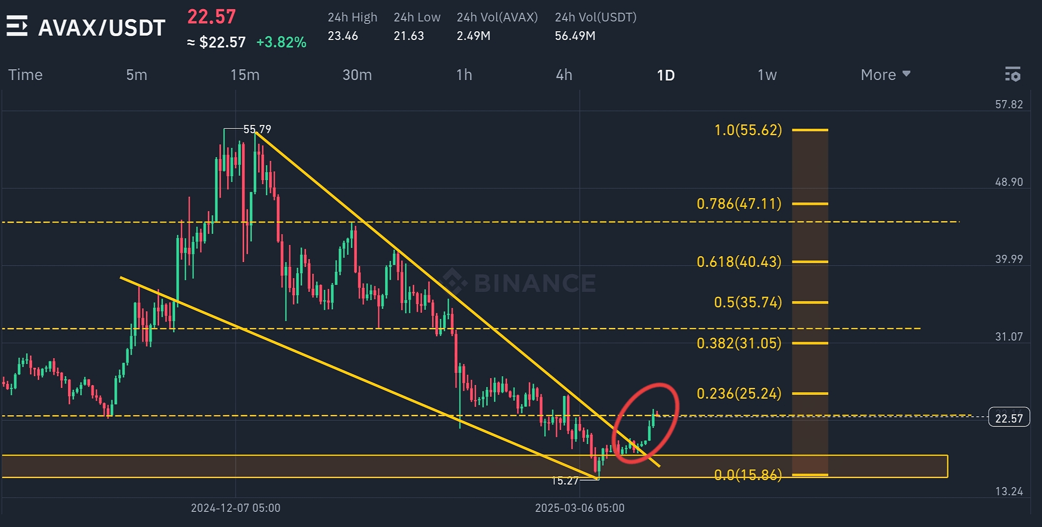 Attualmente a $22.57, AVAX si sta avvicinando al 0.236 Fib ($25.24). Una rottura decisiva sopra quel livello rafforzerebbe la narrativa della rottura rialzista.