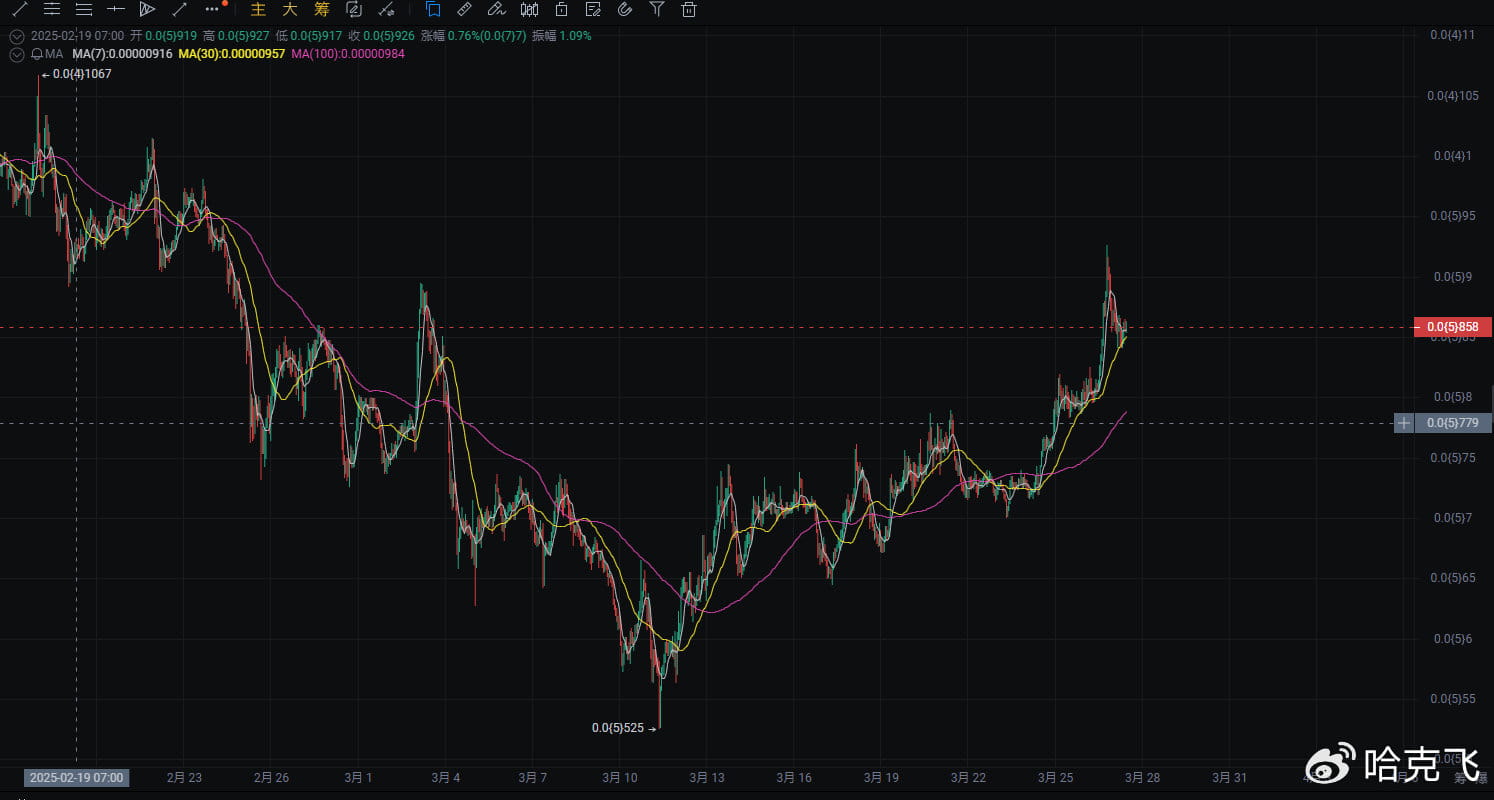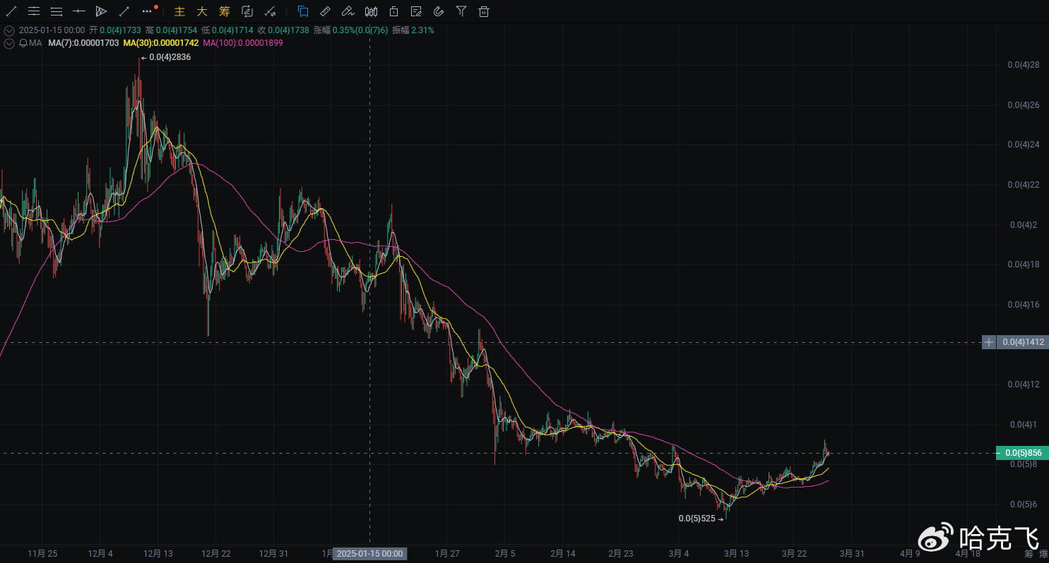 Il prezzo attuale di PEPE è 0.0(5)859, ieri il mercato ha registrato un forte aumento, superando diversi livelli di resistenza chiave. Dalla formazione delle candele, il prezzo è in una chiara tendenza di rimbalzo, con buone probabilità di continuare a salire nel breve termine, ma è necessario prestare attenzione al rischio di ritracciamento.