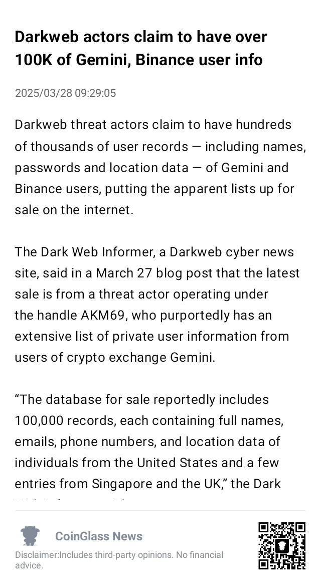 Gli attori della minaccia del dark web affermano di avere centinaia di migliaia di record utente — inclusi nomi, password e dati di localizzazione — di utenti di Gemini e Binance, mettendo in vendita le apparenti liste su internet. Il Dark Web Informer, un sito di notizie cyber del dark web, ha dichiarato in un post del blog del 27 marzo che l'ultima vendita proviene da un attore di minaccia operante sotto il nome AKM69, che presumibilmente ha un'ampia lista di informazioni private degli utenti della piattaforma di scambio di criptovalute Gemini. "Il database in vendita include presumibilmente 100.000 record, ognuno contenente nomi completi, email, numeri di telefono e dati di localizzazione di individui provenienti dagli Stati Uniti e alcune voci da Singapore e Regno Unito," ha affermato il Dark Web Informer. Fonte: Dark Web Informer. "L'attore minaccioso ha categorizzato l'elenco come parte di una campagna più ampia di vendita di dati dei consumatori per marketing legato alle criptovalute, frodi o recupero mirato.". Gemini non ha subito risposto alla richiesta di commento di Cointelegraph. Un giorno prima, Dark Web Informer ha detto che un altro utente, kiki88888, stava offrendo di vendere email e password di Binance, con i dati compromessi che contenevano presumibilmente 132.744 righe di informazioni. Annuncio. Scambia oltre 275 criptovalute con l'app Kraken. Goditi una sicurezza di livello mondiale, basse commissioni e supporto clienti 24/7.