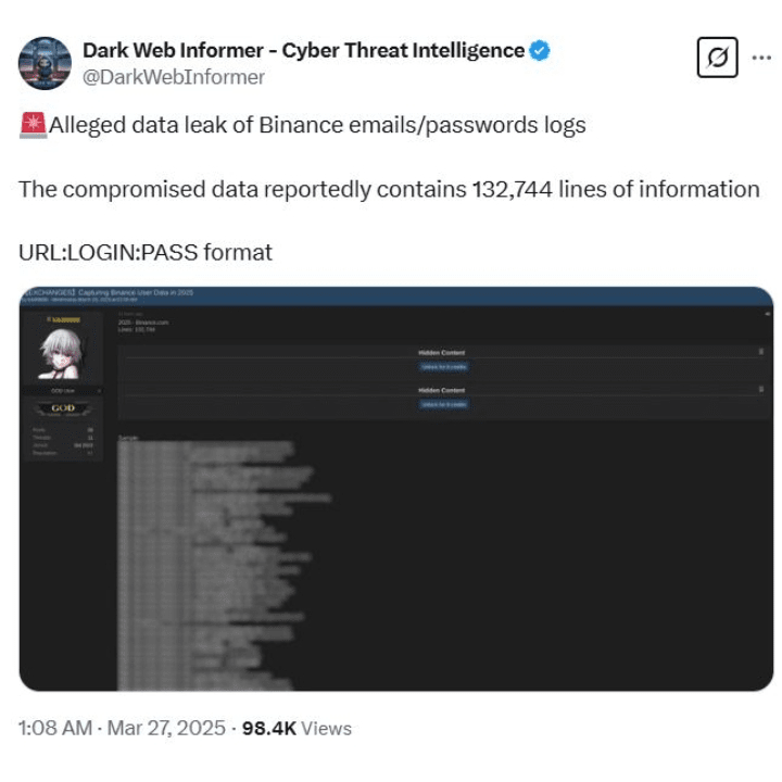 Fonte: Dark Web Informer. Binance afferma che le informazioni trapelate sono arrivate tramite phishing, non da una fuga di dati. Parlando con Cointelegraph, Binance ha detto che le informazioni sul dark web non sono il risultato di una fuga di dati dall'exchange. Invece, è stato un hacker che ha raccolto dati compromettendo le sessioni del browser su computer infetti utilizzando malware. In un post di follow-up, il Dark Web Informer ha anche accennato al furto di dati come risultato del compromettere la tecnologia degli utenti piuttosto che una fuga da Binance, dicendo: "Alcuni di voi devono davvero smettere di cliccare su cose a caso.". Fonte: Dark Web Informer. In una situazione simile lo scorso settembre, un hacker con il nome FireBear ha affermato di avere un database con 12,8 milioni di record rubati da Binance, con dati che includevano cognomi, nomi, indirizzi email, numeri di telefono, compleanni e indirizzi residenziali, secondo i rapporti dell'epoca. Binance ha negato le affermazioni, liquidando la pretesa dell'hacker di avere dati sensibili degli utenti come falsa dopo un'indagine interna del loro team di sicurezza. Correlato: Binance afferma che la fuga di codice su GitHub è 'obsoleta', presenta un rischio minore. Questa non è la prima minaccia informatica che colpisce gli utenti dei principali exchange di criptovalute questo mese. La polizia federale australiana ha dichiarato il 21 marzo di aver dovuto avvisare 130 persone di una truffa di messaggi mirata agli utenti di criptovalute che ha falsificato lo stesso "ID del mittente" di exchange di criptovalute legittimi, come Binance. Un altro simile insieme di messaggi truffa segnalati dagli utenti di X il 14 marzo ha falsificato Coinbase e Gemini tentando di ingannare gli utenti per impostare un nuovo wallet utilizzando frasi di recupero pre-generate controllate dai truffatori. Rivista: Rivelato l'exploit preferito del Gruppo Lazarus — Analisi degli hack delle criptovalute.
