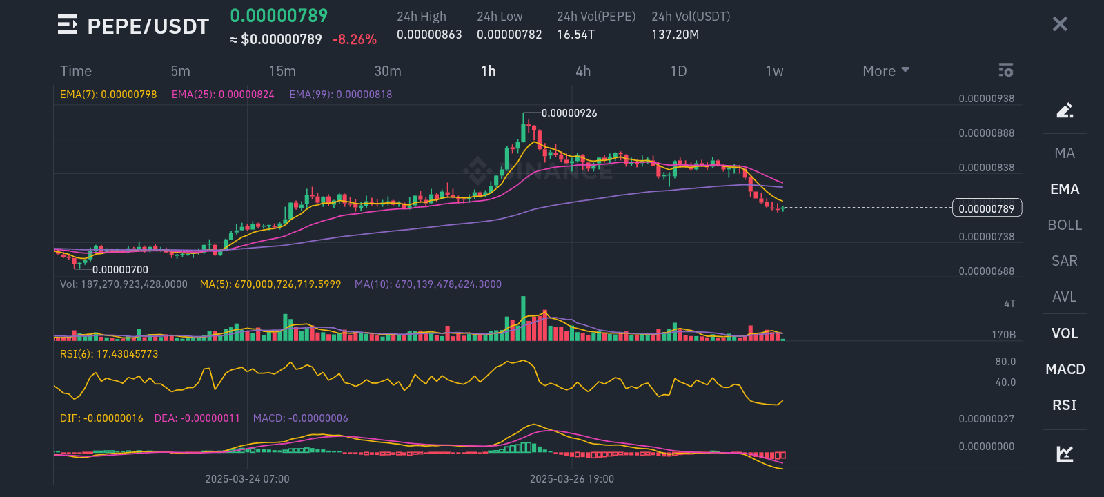 Prezzo Corrente: 0.00000789 24h Alto: 0.00000863 24h Basso: 0.00000782 RSI: 17.43 (Ipervenduto) MACD: Forte Ribassista