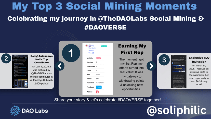 Dall'ottenere il mio primo Rep all'assicurarmi un invito all'ILO, questi momenti hanno definito il mio viaggio nel Social Mining. Mentre DAOVERSE compie tre anni, non vedo l'ora di raggiungere traguardi ancora più grandi