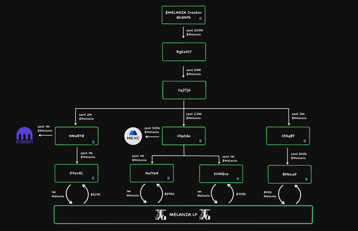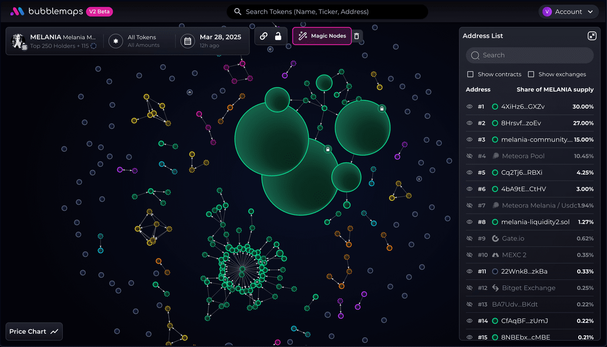 Recenti rivelazioni dalla società di analisi on-chain @Bubblemaps.io , in collaborazione con l'investigatore Coffeezilla, hanno scoperto attività sospette in corso collegate a Hayden Davis e al token MELANIA. Ecco un'analisi dettagliata dei cinque punti chiave della loro indagine: