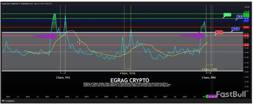 Finora in questo ciclo, XRP ha già completato il suo primo picco RSI, raggiungendo un massimo di 85.17 verso la fine del 2024. Dopo di ciò, l'RSI è stato in una lunga fase di raffreddamento, scendendo a un minimo di 65. Al momento della scrittura, l'RSI si trova intorno a 66 e ci si aspetta un rimbalzo da qui, che dovrebbe raggiungere un picco intorno a giugno.