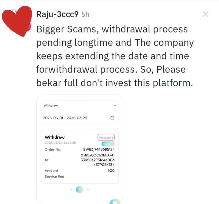 Alcuni utenti si trovano di fronte a questo problema e sono molto delusi da questo progetto Grande Truffa, il processo di prelievo in attesa da molto tempo e l'azienda continua a estendere la data e l'ora per il processo di prelievo. Quindi, per favore, state attenti e non investite in questa piattaforma.