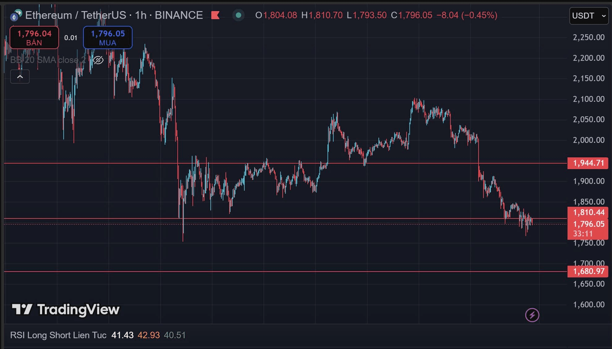 il prezzo è sceso sotto il livello di supporto 1810, il prossimo livello di supporto efficace si trova intorno a 1680. Secondo l'attuale tendenza, la possibilità di scendere al livello di supporto sottostante è molto alta. Un gran numero di posizioni Long in attesa di liquidazione è anche una causa della diminuzione del prezzo, insieme alla psicologia di panico sul mercato che ha causato un'ondata di vendite. Al contrario, ci sono anche molte persone che stanno cercando di assumere posizioni Short a questo livello, sembra che prevedano che il prezzo scenderà a 1000. Consiglio a tutti di mantenere la calma, di non partecipare temporaneamente a Ethereum, e di attendere l'apparizione di segnali chiari.