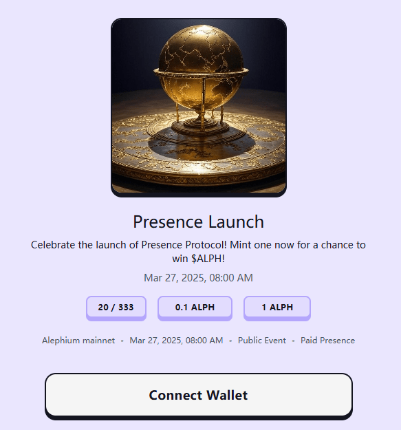 Il 27 marzo, @PresenceProto ha lanciato il protocollo di presenza (@Alephium), un motore NFT creato per la vita quotidiana!