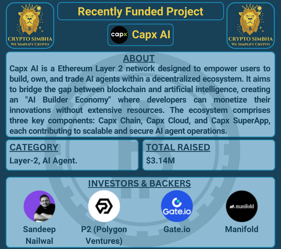 🔹Informazioni: Capx AI è una rete Ethereum Layer 2 progettata per consentire agli utenti di costruire, possedere e commerciare agenti AI all'interno di un ecosistema decentralizzato. Mira a colmare il divario tra blockchain e intelligenza artificiale, creando un'"Economia dei Costruttori di AI" in cui gli sviluppatori possono monetizzare le loro innovazioni senza risorse estensive. L'ecosistema comprende tre componenti chiave: Capx Chain, Capx Cloud e Capx SuperApp, ciascuna contribuendo a operazioni scalabili e sicure degli agenti AI. Capx Chain sfrutta l'Arbitrum Nitro Stack per un'elevata capacità e bassi costi di transazione, semplificando le interazioni con un modello a token singolo. Capx Cloud introduce un framework decentralizzato per il deployment di applicazioni AI, integrando infrastrutture cloud tradizionali e decentralizzate. La Capx SuperApp facilita la scoperta e il commercio di agenti AI, rendendolo accessibile a un pubblico più ampio. Con un focus sulla decentralizzazione e trasparenza, Capx AI riduce le dipendenze di fiducia e migliora la governance. Il suo approccio innovativo affronta sfide come esperienze utente frammentate e integrazione dell'ecosistema.🚀🌐