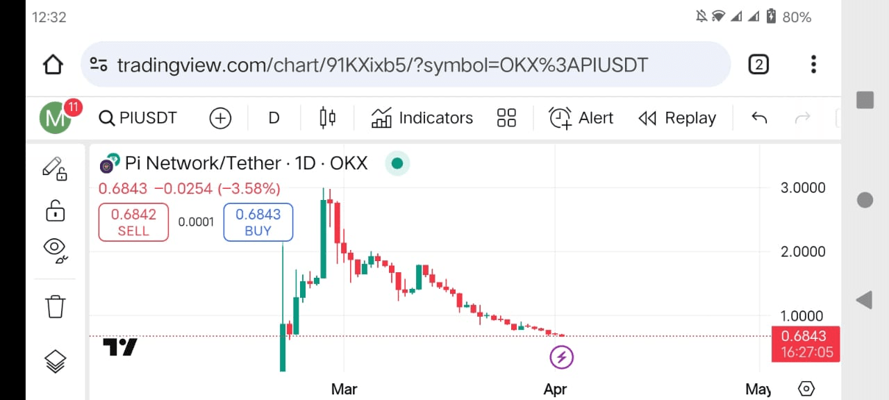 L'immagine mostra un grafico giornaliero per la coppia di trading PIUSDT su OKX. A partire dalle circa 12:32 PM PST in quello che sembra essere all'inizio di aprile 2025: