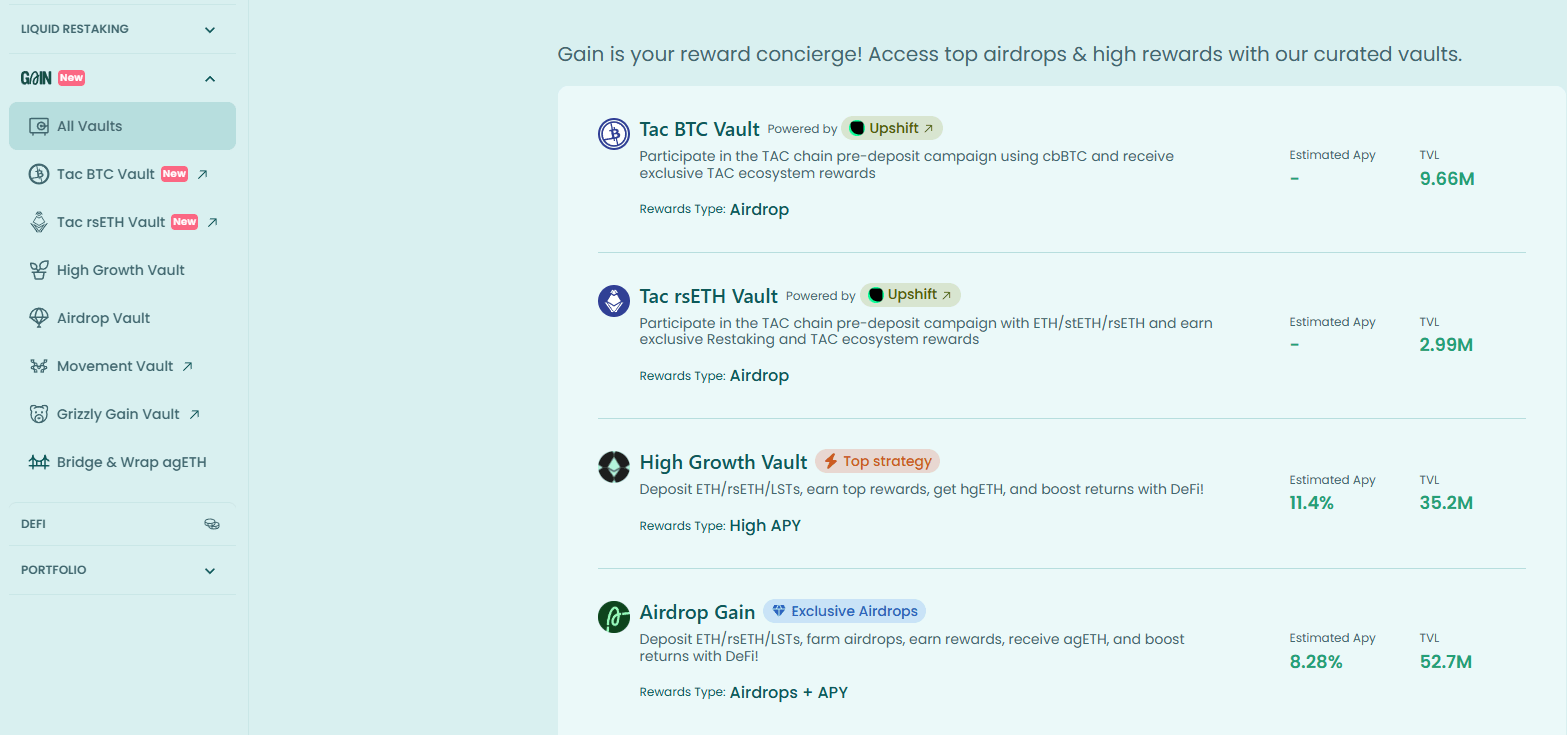 Gain completa l'ecosistema con i suoi vault tokenizzati, vantando oltre 150 milioni di dollari in TVL. Questi vault offrono quattro strategie personalizzate per soddisfare i diversi obiettivi degli investitori: