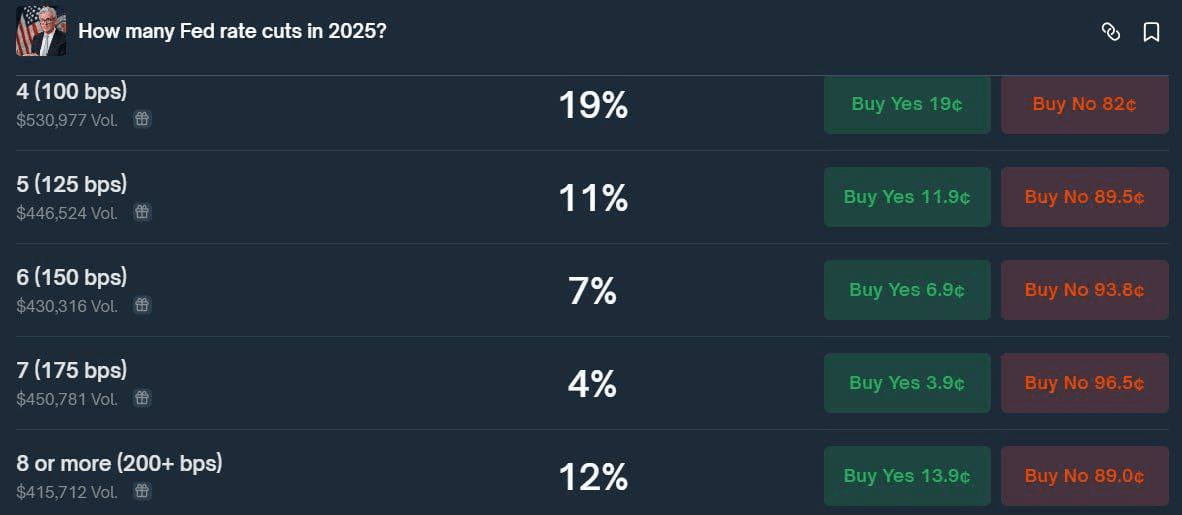 DOPO IL CRASH DI IERI, POLYMARKET MOSTRA ANCHE IL 53% DI PROBABILITÀ DI 4 O PIÙ RIDUZIONI DEI TASSI NEL 2025.