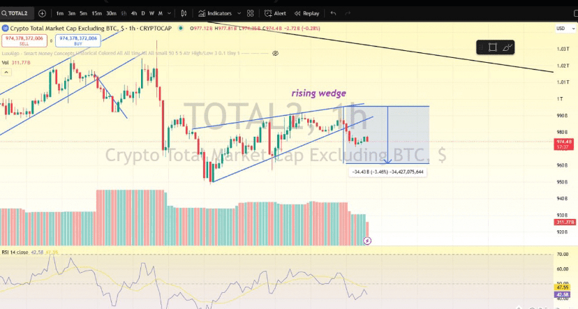 Il Totale 2 (capitalizzazione di mercato delle criptovalute escluso BTC) è sceso da un cuneo ascendente — un pattern ribassista. Questo indica un momentum ribassista, quindi gli altcoin potrebbero iniziare a scendere presto.