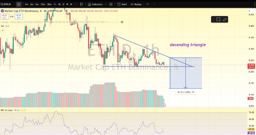 La dominanza di ETH sta formando un triangolo discendente — un pattern grafico ribassista. Un retest verso la linea di tendenza superiore è probabile, ma dopo ciò, potremmo vedere un altro movimento verso il basso. Fai attenzione e gestisci sempre il tuo rischio. Evita di usare leva alta.